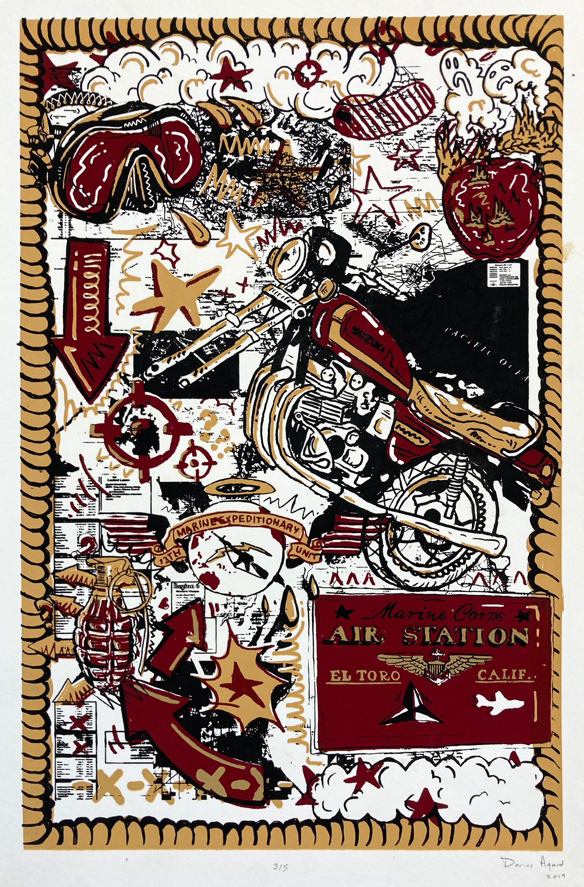 This print is inspired by Patrick’s experience but also the way he tells his story. The background contains a collage of images from all the places he’s traveled through the military. Siting in the foreground are symbols I’ve created to sit on Patrick’s map of his own personal experience. They range from burning apple orchards and rouge grenades to meeting his wife and getting to know her through a broken down motorcycle on a military base in California.