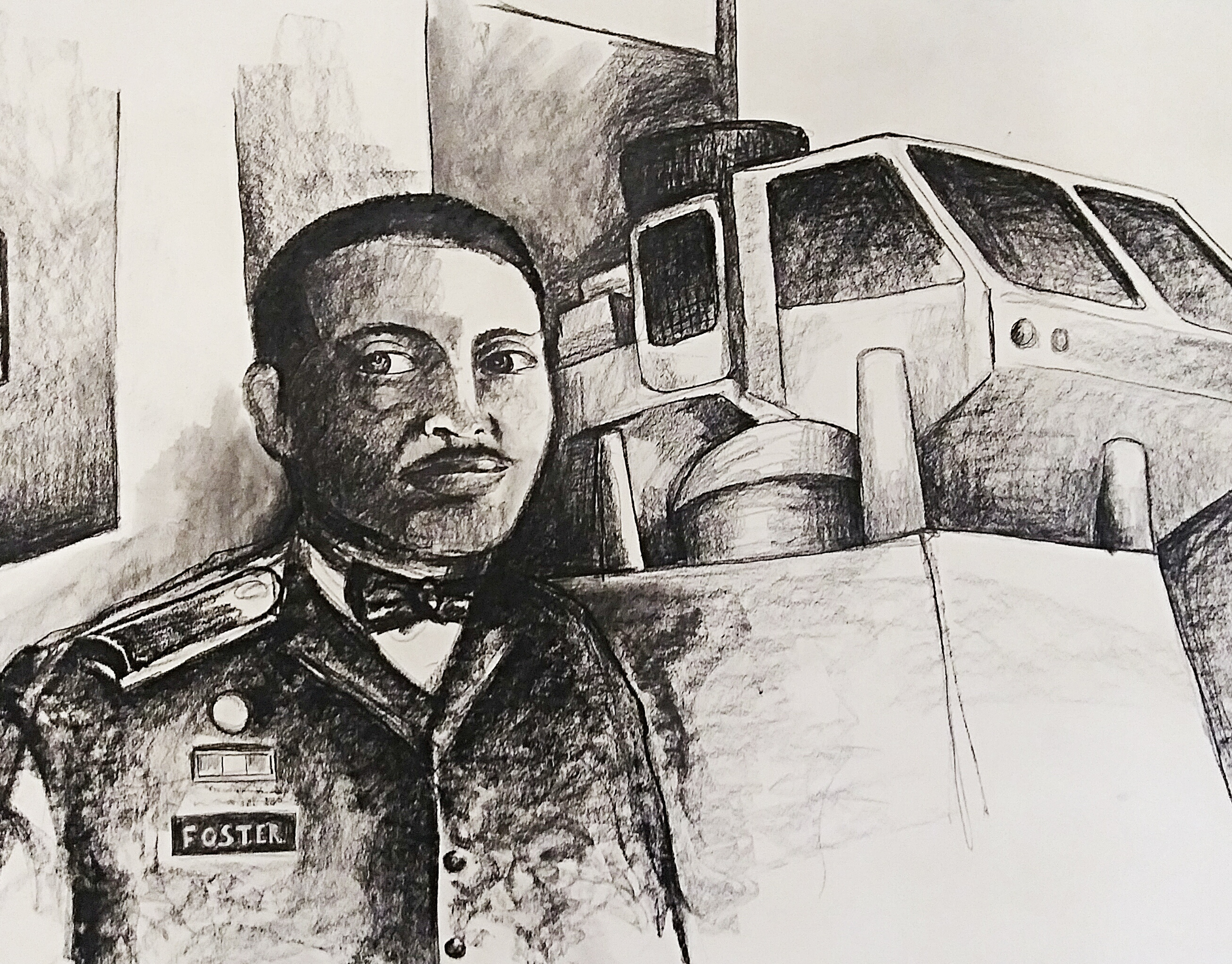 The conversations translated into a portrait of veteran Rochelle L. with her son. In this piece, I wanted to portray elements that revolved around her character and her memories. Through the conversations, some images stuck more than others, most important conversations about her son. She became an EMT during a part of her life that when she was gone. Her little boy would get excited every time he saw an EMT truck. She was deployed when her son was 11 months old. The sparrow represents to her the quote “always together” as a personal reminder she has tattooed about her son. The MRAP (truck) represent the vehicles from the base they had in Iraq, or as she likes to call them” jeep on steroids”. The boy is sitting on a tent as a representation of her life, growing up in a military base while her dad was a medic, and always wanted to be a soldier. The idea of the composition came when she spoke about the welcoming of veterans and their set up under the tents and how she got to hug her son for the first time in what seemed like forever. He is the reason she overcame a lot of obstacles. She stated that being a woman in the military is rough, but motherhood is a lot worse.